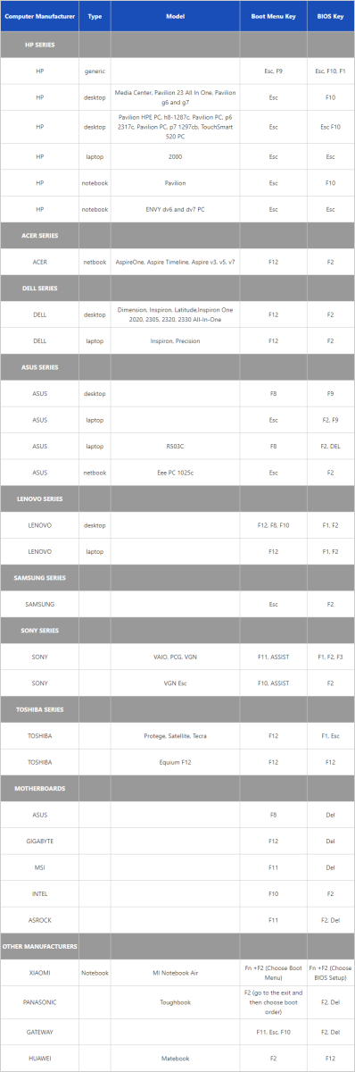Common keys: F12, Esc, F8