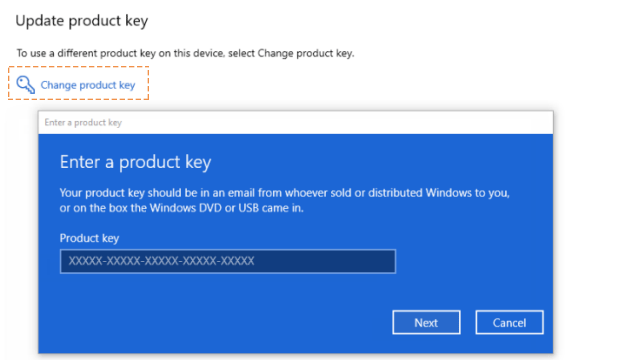 Settings → Update & Security → Activation → Change product key